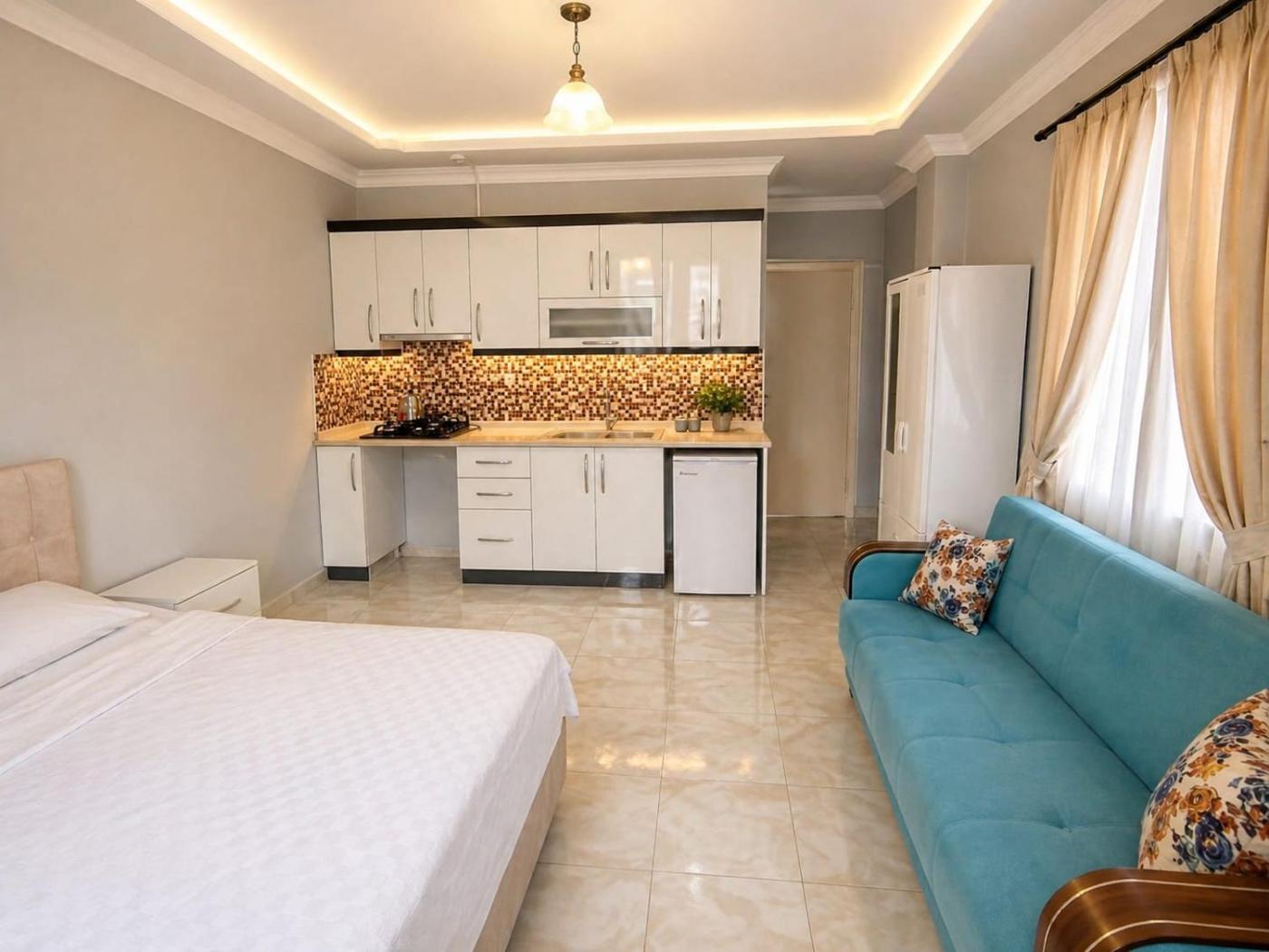 İki Odalı Daire. This air-conditioned apartment comprises 1 living room, 1 separate bedroom and 1 bathroom with a shower. Meals can be prepared in the well-fitted kitchen, which comes with a stovetop, kitchenware and an electric kettle. Featuring a balcony with garden views, this apartment also provides a minibar and a flat-screen TV. The unit offers 4 beds. ;